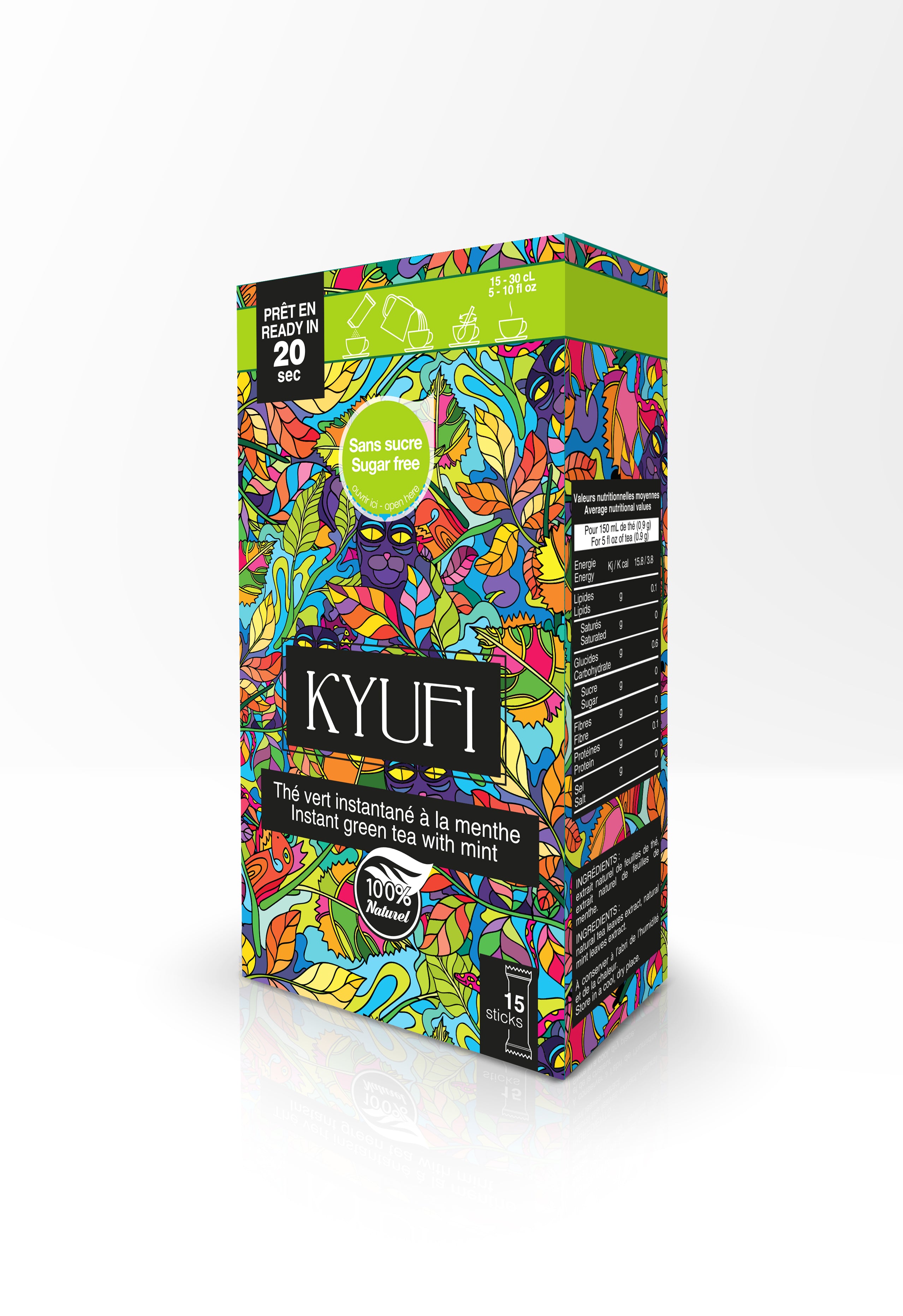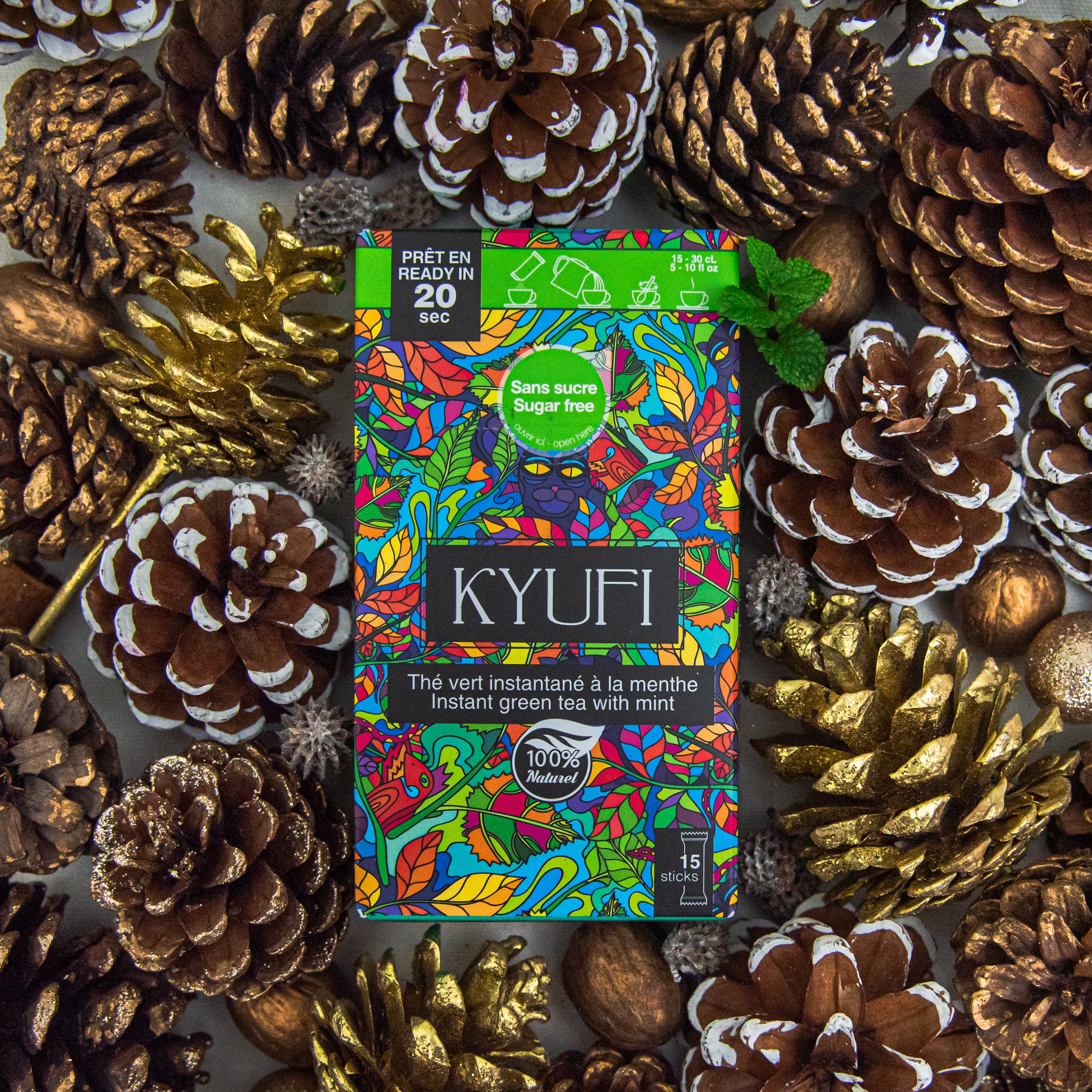 Le mélange Kyufi 100% naturel, inspiré de la tradition marocaine du thé vert à la menthe vous offre un moment gourmand et sain en 20 secondes chrono.